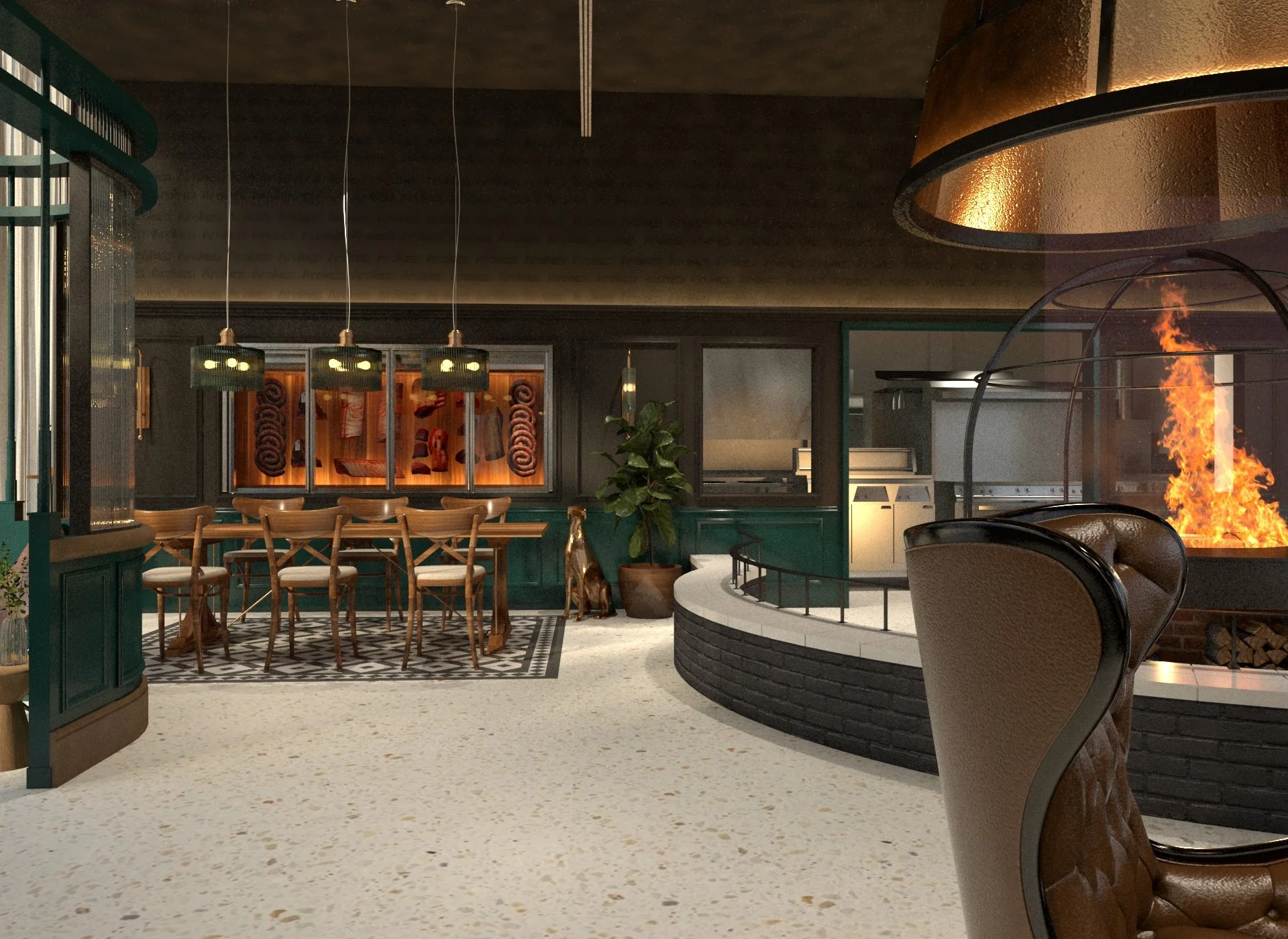 With subtle nods towards the English Inns of old, Arokazi is a steakhouse that boasts a large open flame grill as a focal point and a layout that radiates from it. Interiors borrow from a mix of the traditional British Inns and rural taverns that birthed the first chop houses as well as the darker industrial rawness of the weathered grill frames, embers in charcoal and polished metal that make the cuisine what it is. Prominent elements of copper are introduced to bridge the gap between these themes and balance them.